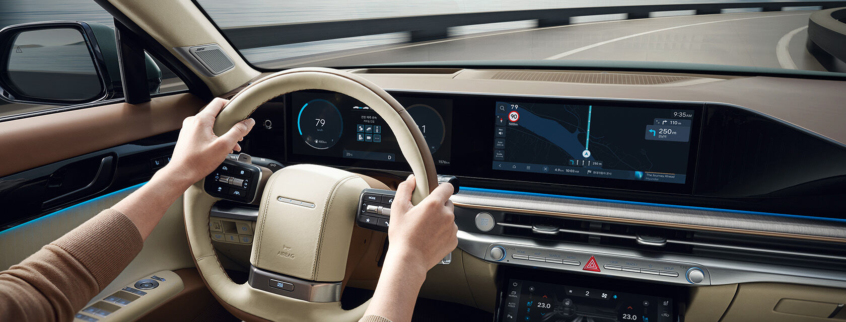 현대 차세대 인포테인먼트 시스템인 ccNC(connected car Navigation Cockpit)을 적용한 파노라믹 디스플레이로