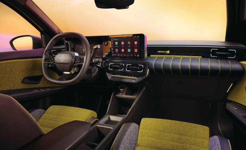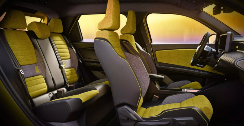 르노5의 내부 디자인은 소형차라고 볼 수 없게 넓은 공간을 자랑합니다. 전기차의 특성으로 전면의 엔진과 변속기가 사라지며 전륜 바퀴를 조금 더 앞으로 이동 시켜 축거 길이를 넓게 뽑았다고 할 수 있습니다.
